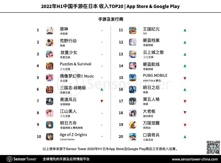 多款IP手游2022年上半年在日本商场增加非常亮眼,其间包含腾讯光子工作室联合EA研制的《Apex英豪手游》,凭借端游IP的强壮号召力,敏捷跻身本期日本手游下载量增加榜第1名。与此同时,三七互娱《云上城之歌》、灵犀互娱《三国志梦想大陆》以及乐元素《偶像梦境祭!! Music》等手游著作入围本期日本收入增加榜Top10。