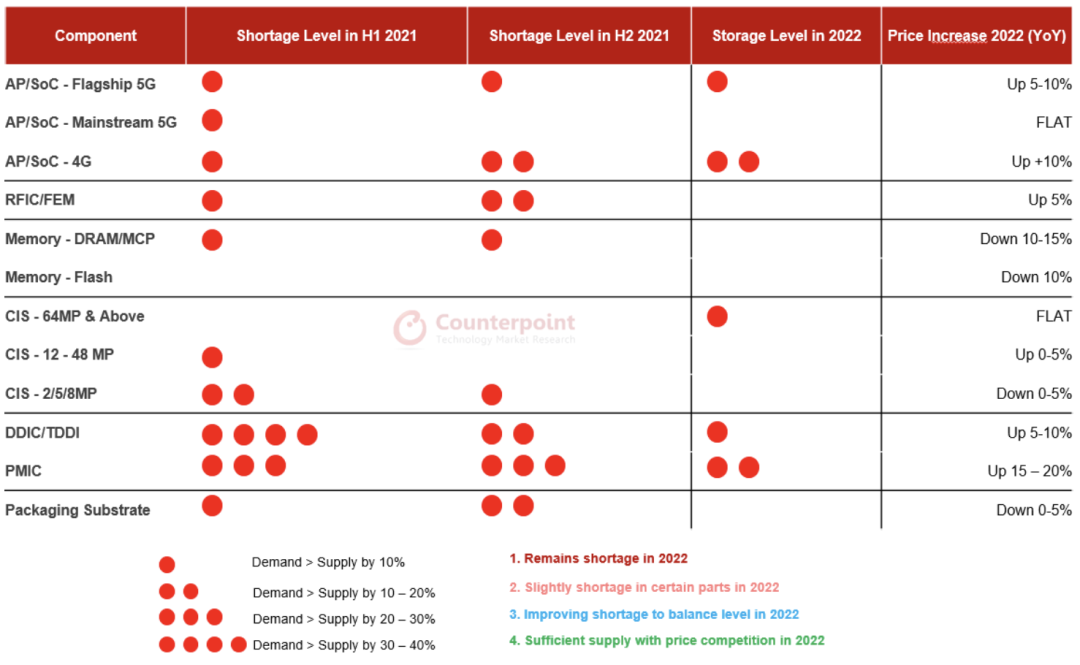 Counterpoint Research 最新的智能手机零部件追寻陈述显现,跟着大多数零部件供需缺口的缩小,全球半导体芯片缺少的状况或许会在 2022 年下半年持续得到缓解。