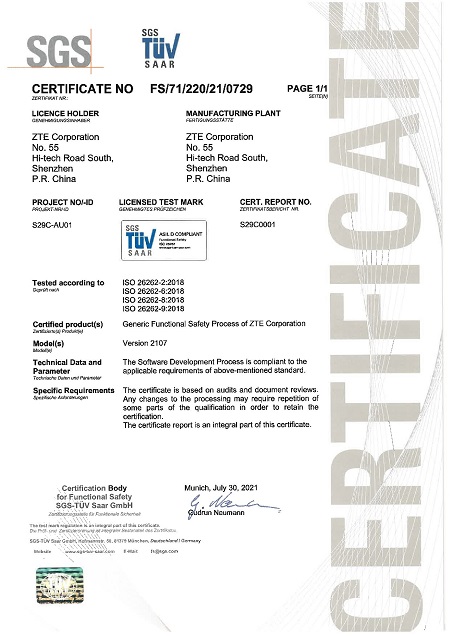 近来,世界公认的查验、判定、测验和认证安排SGS向中兴通讯体系产品渠道颁布了 ISO 26262:2018 ASIL-D级轿车功用安全流程认证证书,该等级为轿车行业的最高功用安全等级。