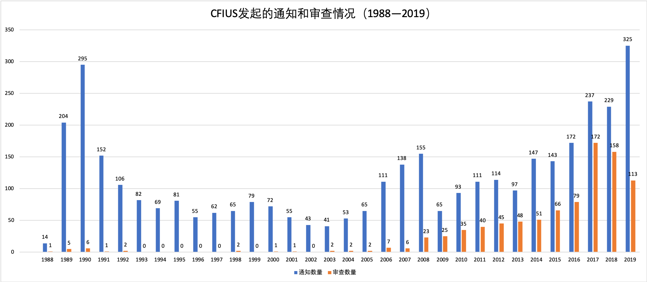 依据现在发表的数据显现,自1988年到2019年,CFIUS共建议了3730项告诉和893次检查。值得一提的是,自2008年曾经,在1997项告诉中只建议了61次检查,仅达到了3%的检查份额。而在此之后的十年间(2009-2019),CFIUS则对1733项告诉建议了832次检查,达到了48%的检查份额。此外,TechCrunch