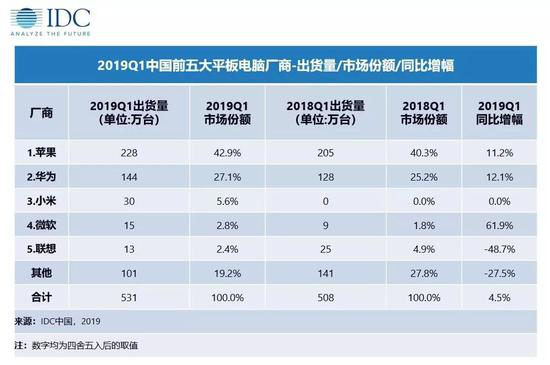 2019年第一季度我国平板电脑商场前五大厂商概览分别是苹果:继续坚持抢先优势。苹果2019年一季度出货量约228万台,同比增加11.2%,占有42.9%商场份额。