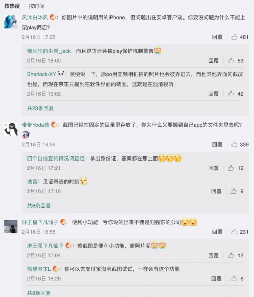 称,关注到相关问题后,进行了技能排查和处理,并表明京东金融绝不会搜集未经用户授权的任何信息,更不会盗取。京东金融还对相关功用进行了阐明,称这么做是为了便于用户传送京东金融 app 截图给客服进行问题反应,app 缓存图片会“乖乖地待在用户的手机里”。京东金融在回应中许诺“绝不会搜集未经用户授权的任何信息”,并表明现已对“图片帮手”功用下架处理,待进一步改善安全体会后再上线。