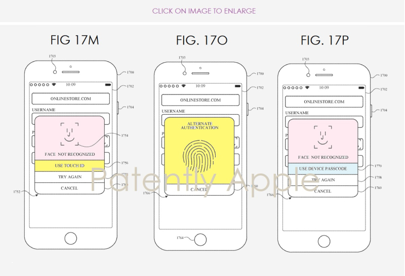 苹果在这份请求中给出的一组图片显现,设备会先选用人脸辨认进行验证,失利后改用指纹辨认。苹果会常常运用一些较早版别设备的图片来阐明原理,图片中的设备是一款没有选用全面屏规划的 iPhone。