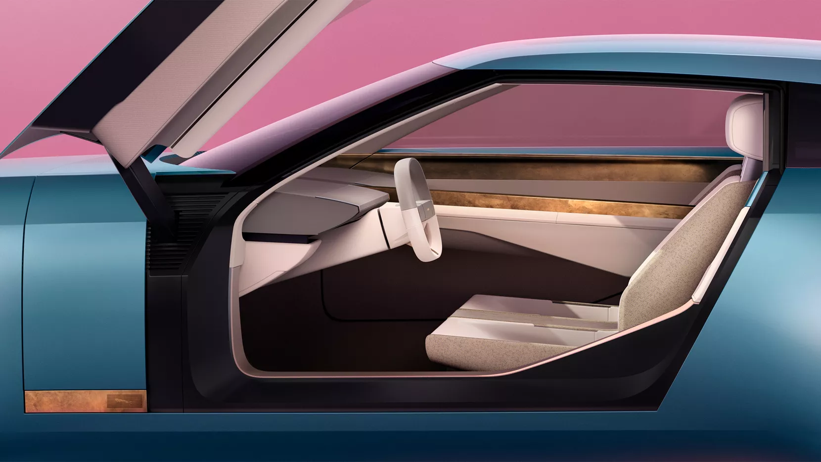 舒缓的石灰华石充任底座,支撑起浮座椅和中心脊柱。它启示了内饰丰厚层次的色彩。织造纺织品增添了工艺感。触感羊毛混纺面料的构思来自手艺织造纱线,包裹着两个座椅、条形音箱和地板。